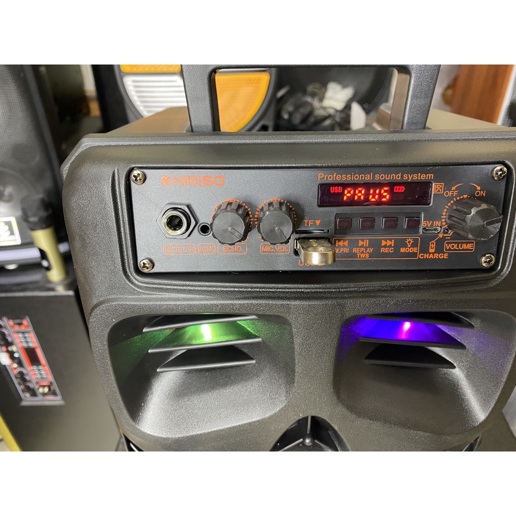 Bộ loa kéo di động bluetooth không dây kimiso QS-7801 kèm theo 2 micro có dây HÁT SONG CA đồng thời , âm thanh chất lương cao, âm bass hay, hỗ trợ cổng usb, Cổng 3.5, thẻ nhớ tf