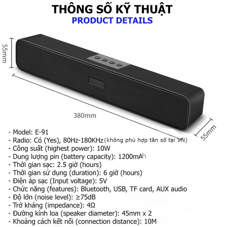 Loa Bluetooth 2.2 E-91, Loa Đôi, Âm Thanh Trung Thực, Hỗ Trợ Thẻ Nhớ, USB, Jack 3.5