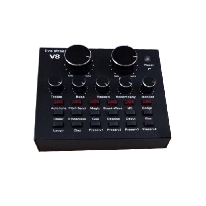 Sound card thu âm V8 là sản phẩm card âm thanh tương thích với nhiều thiết bị như smartphone, laptop, pc, máy tính bảng. Với tính năng làm méo giọng hát, thành giọng trẻ em, người già, Khả năng chèn các hiệu ứng âm thanh vào các đoạn thu như tiếng vỗ tay, tiếng hò reo, nhạc cổ vũ, tiếng chim kêu... với 12 hiệu ứng âm thanh, sẽ đem lại cho bạn trải nghiệm thu âm vô cùng thú vị.